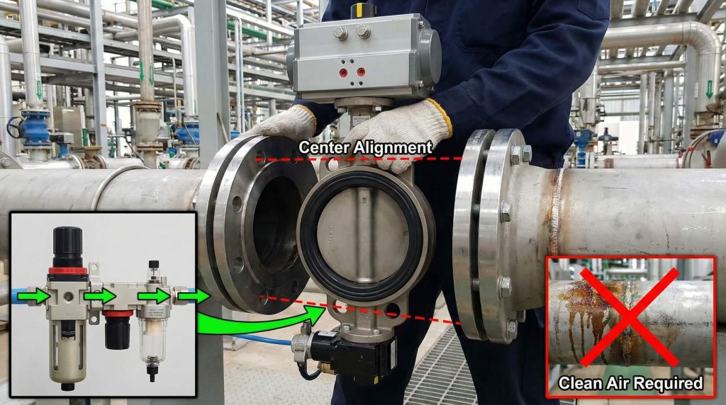 Installing a solenoid operated butterfly valve requires attention to both the piping and the air supply. You must ensure that the valve is centered between the flanges to prevent the disc from hitting the pipe wall.
