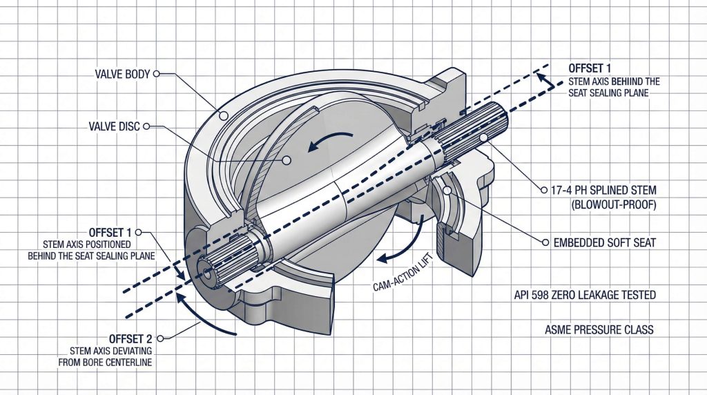 Dual offsets prevent the disc from dragging against the seat, which preserves seal integrity and lowers power requirements.