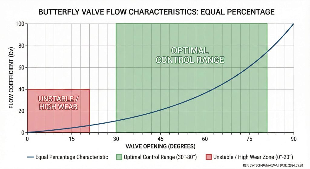 The 30 to 80-degree range is the best because it provides the most predictable flow response while protecting the seat from high-velocity erosion. Operating below 30 degrees creates high-speed fluid “jets” that can quickly destroy elastomeric seals.