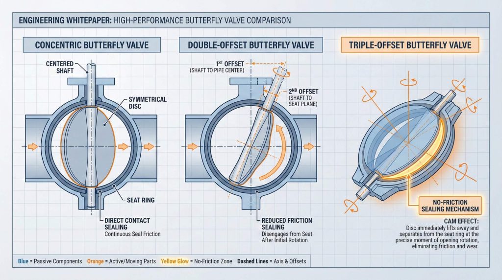 In a concentric valve, the disc remains in contact with the seat for much of its travel, which leads to wear. Offset designs move the shaft behind the disc, allowing it to “cam” away from the seat almost immediately.