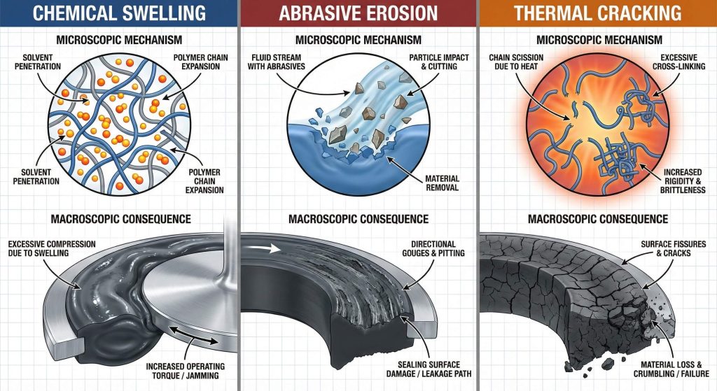Failure modes in the guide include chemical attack, swelling, and mechanical erosion that compromise your system. Understanding these patterns allows you to pick a better material for your next maintenance cycle. Mechanical wear happens when abrasive particles gouge your elastomer surface over time. Thermal degradation leads to hardening, which makes your seal crack under pressure.