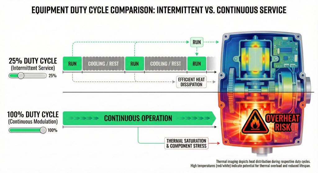 The duty cycle is essentially the ratio of a valve’s “on” time versus its “off” time during a standard hour of operation. Here’s the deal: a motor designed for 25% duty will quickly burn out if it is asked to modulate flow 100% of the time.