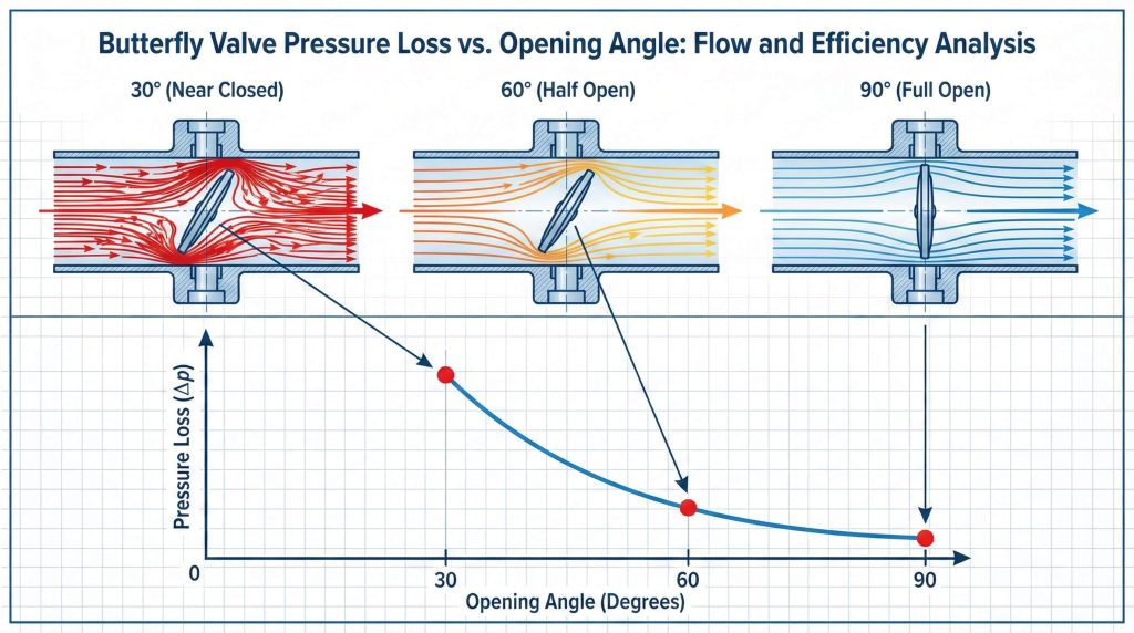 The opening angle affects pressure loss because it changes the projected area of the disc relative to the direction of the flow. As the disc rotates, the flow area expands or contracts, which dramatically alters the resistance coefficient.