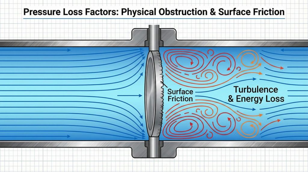 The primary causes of butterfly valve pressure loss are the physical obstruction of the disc and the surface friction generated as fluid moves across the valve internals. Even in a fully open position, the disc remains in the flow stream, creating a wake that dissipates energy.