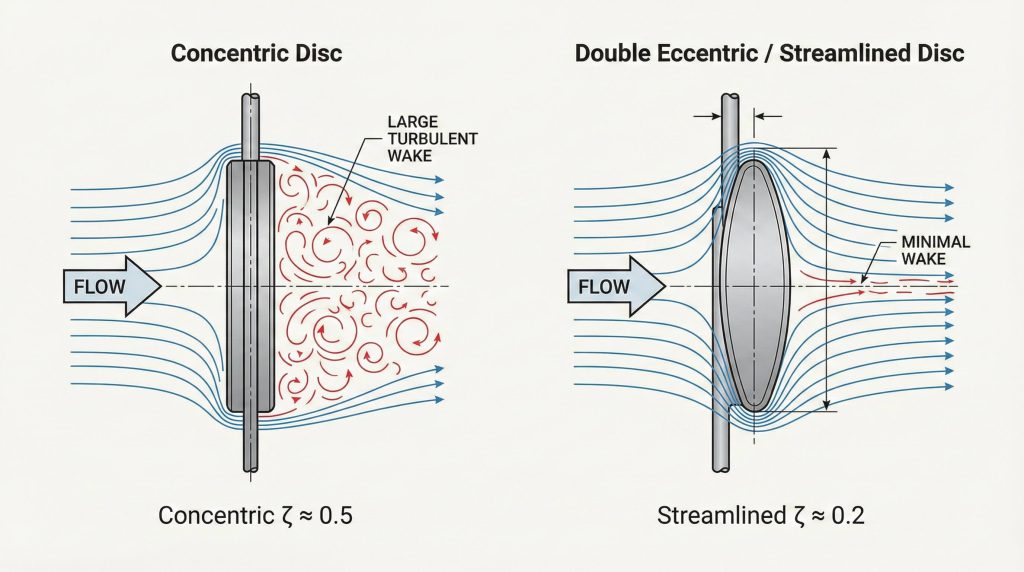 Concentric discs are common in low-pressure systems but can create more turbulence because the stem passes directly through the center of the flow. Eccentric designs often allow for a more streamlined disc edge.