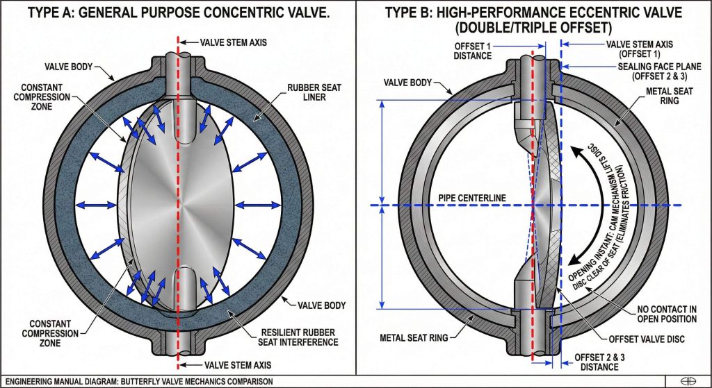 Category B valves utilize eccentric offsets to reduce friction between the seat and the disc during rotation.