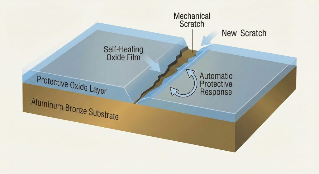 Aluminum bronze is unique because of its ability to repair its own protective surface. When the metal is exposed to oxygen—whether in the air or dissolved in water—it immediately forms a tough, adherent layer of aluminum oxide. If the bushing surface is scratched by a particle in the fluid stream, the exposed metal reacts with the environment to reform the barrier almost instantly.