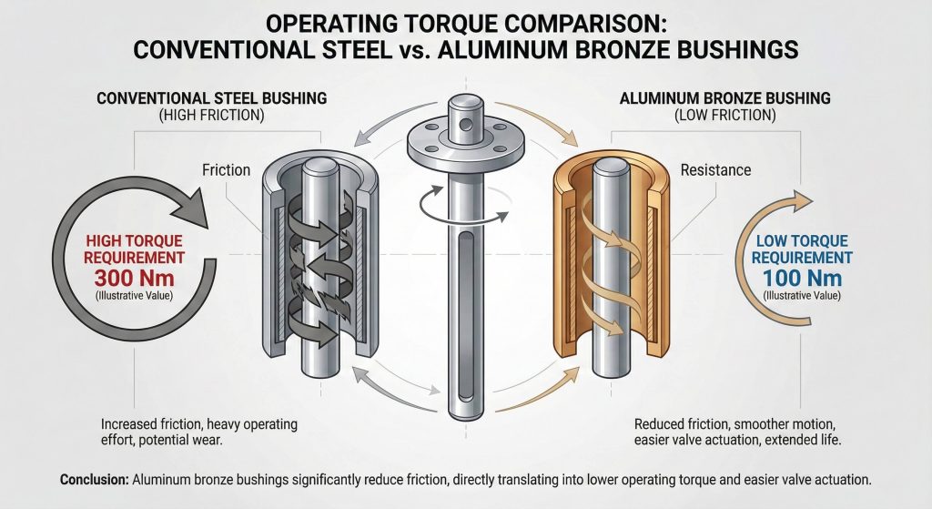 Lowering the coefficient of friction at the stem interface is the most effective way to reduce the total operating torque of a valve. Because aluminum bronze is significantly more “slippery” than stainless or carbon steel, it allows the stem to rotate with minimal resistance. This reduction in force directly impacts the lifecycle of the entire valve assembly, as it reduces the mechanical strain on the stem and the internal seals.